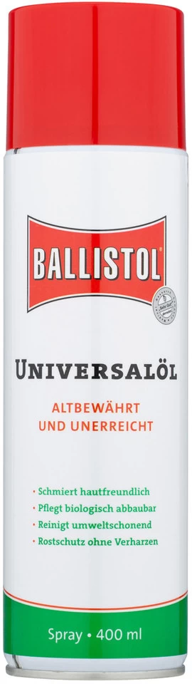 Distinciones:Ballistol es absolutamente inocuo para la piel y ha sido probado por «Dermatest» con «Muy bueno».La revista «selbst ist der Mann» informa en su número 7 / julio de 2013 sobre el aceite universal Ballistol. «selbst ausprobiert» le dio a este aceite 5 de 5 martillos.Características:mantiene, lubrica, desinfecta, protege contra el óxidose cuela en los rincones más finos, es deslizanteno se resinifica, es completamente biodegradableseguro para los alimentos, respetuoso con la piel y completamente inofensivoel truco secreto del taller casero, la industria y el comerciolimpia cadenas, horquillas de suspensión y cables Bowdenideal para la pausa invernal y la restauraciónperfectamente adecuado para la limpieza y el cuidado de horquillas de suspensión Fox y RockShoxNúmeros de fabricante:50 ml:21450200 ml:21700400 ml:21810Volumen de envío:1 x Aerosol en lata aceite universal Ballistol