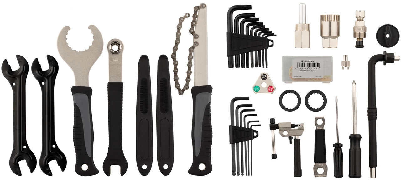 Se incluye un extractor de bielas y una herramienta de ejes de pedalier para cambiar rodamientos de cartuchos. La llave de cazoletas externas se ajusta a todos los rodamientos convencionales Hollowtech II, GXP y Campagnolo. Gracias a la abertura de la llave, los rodamientos también se pueden reajustar sin desmontar la biela. Para Shimano SM-BB9000 BB93 y SM-BBR60 se incluyen adaptadores adecuados. Incluso las ruedas se pueden tensionar con la llave de radios o los rodamientos cónicos se pueden reajustar. Por supuesto, también se incluyen todas las herramientas para trabajos de montaje sencillos, como el cambio de accesorios o el ajuste del sistema de cambios. Para cambiar los insertos de válvulas coche/AV-/Schrader y válvulas Sclaverand/SV/Presta/, francesa de bici de ruta se incluye una llave de válvula adecuada en el volumen de suministro. Los desmontadores de cubiertas estables te permiten cambiar cubiertas rebeldes y los parches autoadhesivos te permiten volver a montar rápidamente después de un pinchazo.
