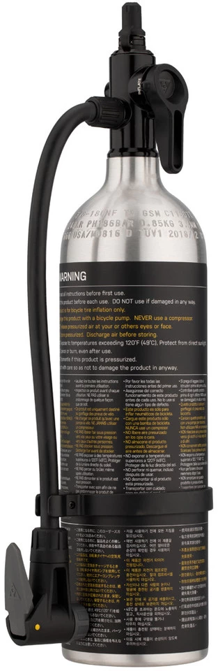 Especificaciones:Tipo de bomba:CO2 InflatorPresión (máx.):La cámara de aire puede inflarse hasta 14 bares (200 psi) (dependiendo de la bomba de pie utilizada)Cabezal de bomba:PrestaVálvulas de cubiertas:Presta, SchraderDatos técnicos:Material del Inflator:Compuesto de fibra de vidrio, gomaMaterial del tanque de aire comprimido:AluminioMedidas (La x An x Al):36 x 11,4 x 8,6 cm (inflador + tanque de aire comprimido), 28,5 x ø 8,1 cm (sólo tanque de aire comprimido)Características:puede ser usado en el camino con cartuchos roscados de 16 g y 25 g de CO2 de Topeakla manguera flexible integrada con el cabezal de bomba alivia el vástago de la válvulaCharge-Modus para llenar el tanque, Inflate-Modus para inflar las cubiertasVolumen de envío:1 x CO2 Inflator Topeak TubiBooster1 x Tanque de aluminio Topeak 1 litro