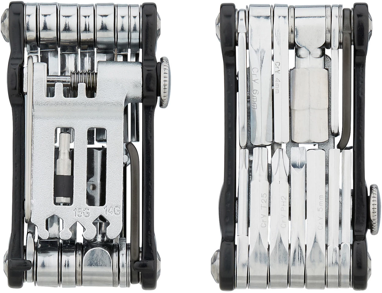 Especificaciones:Función:Herramienta multiusos multitool abre y cierra cadenasTipo de herramienta:Llave de tubo, destornillador, destornillador de cabecillas, herramientas especialesModelo:Torx, llave hexagonal, destornillador plano, destornillador de estrellaCompatibilidad:Con portabidones Ninja Master+Datos técnicos:Material Herramientas:Acero (CrV)Material cuerpo:AluminioMaterial del tronchacadenas:Acero (CrMo)Material del gancho de fijación de la cadena:de acero inoxidableMaterial Destapador:Acero (endurecido)Material desmontadores de cubiertas:AluminioFunciones:Llave hexagonal: 2 L / 2,5 / 3 / 4 / 5 / 6 / 8 / 10 mmTorx: T10 / T25Destornillador: plano, estrella Phillips #2Llave de radios: 14G (3,4 mm) / 15G (3,2 mm) / Mavic M7 / Shimano 4,3 mmTronchacadenas para Single y Multi-Speed hasta 12 velocidades, no es compatible con cadenas Hollow Pin de 11 velocidades de Campagnologancho de fijación de cadenaDesmontador de cubiertasDestapadorSoporte de radiosTronchacadenasCaracterísticas:herramientas estables para casi todas las necesidadesincluye desmontadores de de cubiertas para casos de emergenciacarcasa compacta y resistente a la intemperieCage Mount para fijación en portabidones de las series Ninja Master+ CageFrame Mount para fijación en cuadros, potencias, tijas de sillín o soporte de portabidonesNúmero de fabricante:TNJA-T20