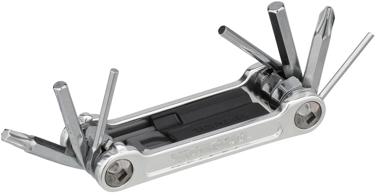 Datos técnicos:Campo de aplicación:RutaMaterial herramientas:Cromo-Vanadio-Acero, acero reforzado para herramientasMaterial cuerpo:aluminio forjado en frío, anodizadoMedidas (La x An x Al):7,6 x 2,6 x 1,6 cmFunciones:9Otros:incluye bolsa de neoprenoFunciones:Destornillador de estrellaTorx T25Llave hexagonal: 2 / 2,5 / 3 / 4 / 5 mm2 Desmontadores de cubiertas (1 x de acero de herramientas reforzado, 1 x compuesto de fibra de vidrio)Números de fabricante:plata:TT25515negro:TT25518Dorado:TT2551GDVolumen de envío:1 x Herramienta multiusos Multitool Topeak Mini 9 Pro1 x Bolsa Topeak Neopren
